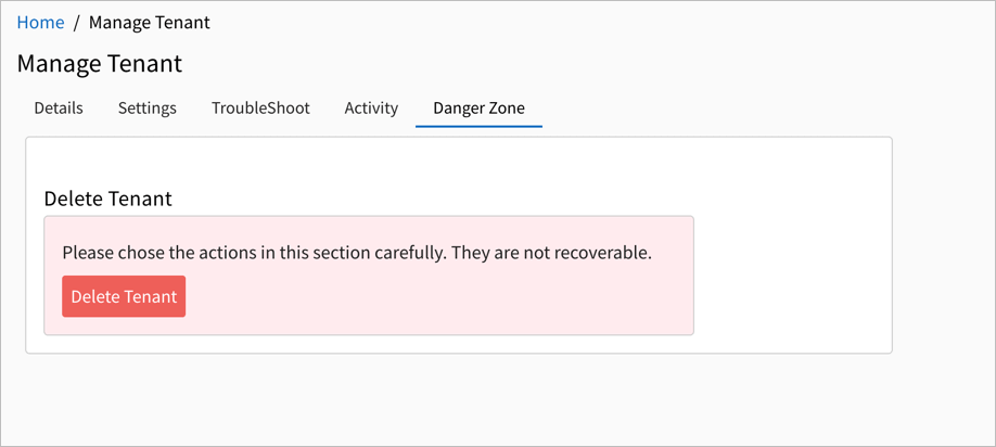 The "Danger Zone" tab contains critical actions that can have significant impacts on your tenant. These actions should be performed with caution.