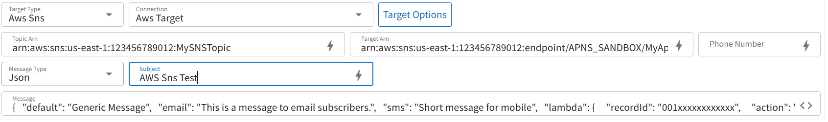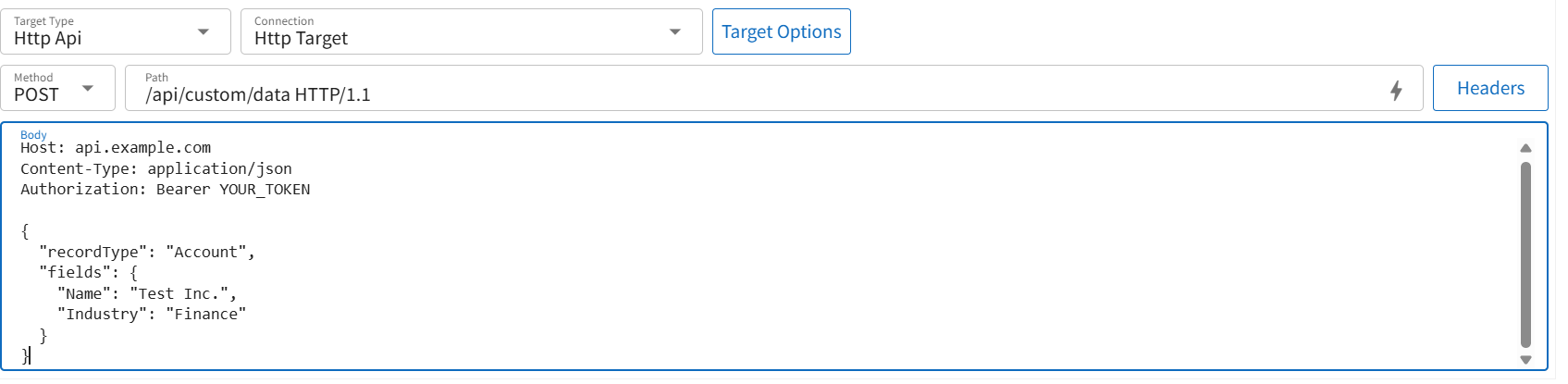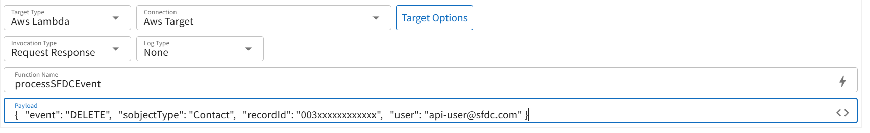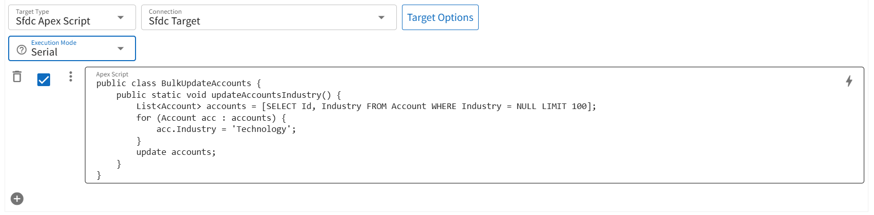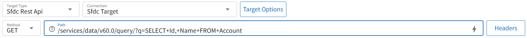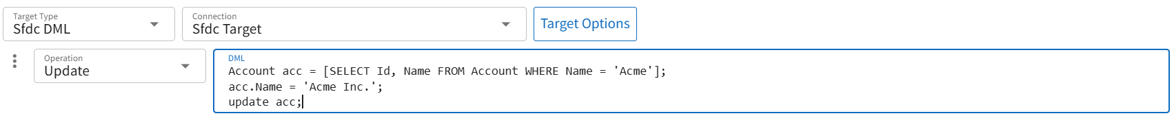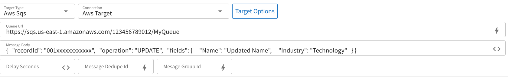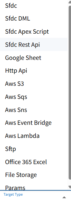 Set the Target Type to one of the supported output destinations:SfdcSfdc DMLSfdc Apex ScriptSfdc Rest APIGoogle SheetsFile StorageHttp ApiAWS Services(SQS, SNS, Lambda)SftpOffice 365 Excel