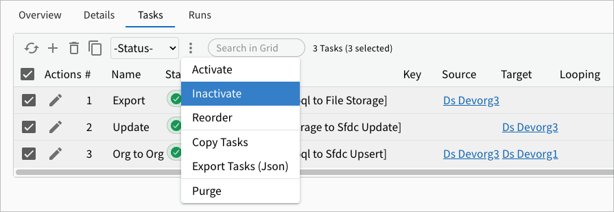 To activate or inactivate multiple Tasks, click on the checkboxes next to one or more Tasks in the Tasks List page and