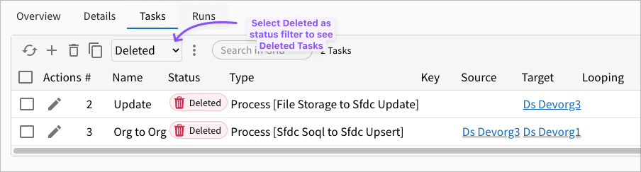 list page. To show the deleted Tasks, change the status filter to Deleted