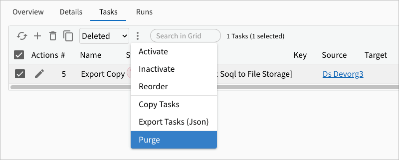 To permanently delete one or more deleted Tasks, you can purge it. To do that, first change the status filter to