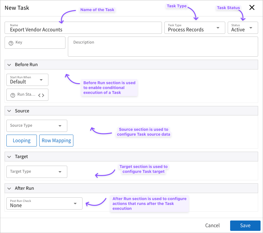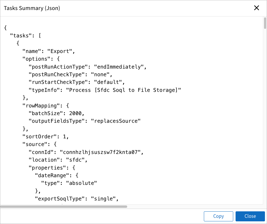 As you will get to know later as you explore various Tasks, there can be a lot of configuration in some tasks. If you want to be able to search deep in Task configuration, you can export one or more Tasks to a JSON file.