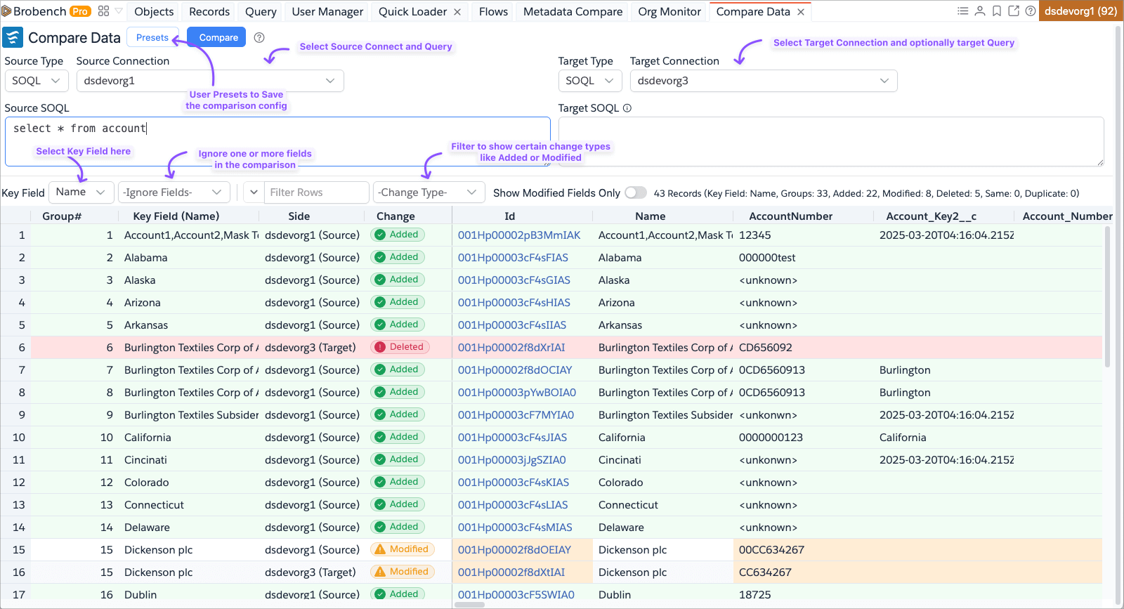 Compare Data module allows you to compare datasets between two sources and identify differences. This powerful feature helps you analyze data discrepancies between different environments, validate data migrations, or compare datasets from different sources.