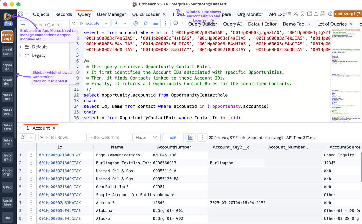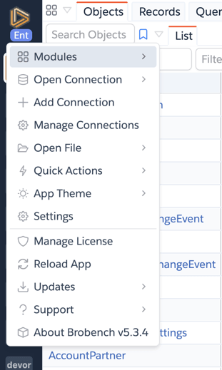 The Brobench menu lets you manage connections, license details, and other app settings.