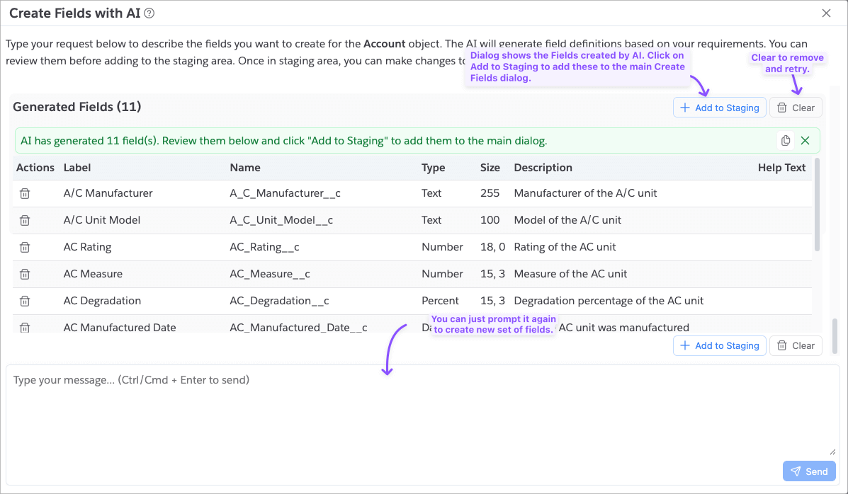 App will process your request using AI and show the generated fields in the below dialog. Note that at this time, fields aren’t created yet.