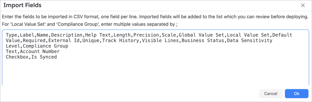 If you’re creating a lot of fields, it can be painful to keep clicking and entering the field details. To make it easier, you can prepare a CSV file with the field details and import it.