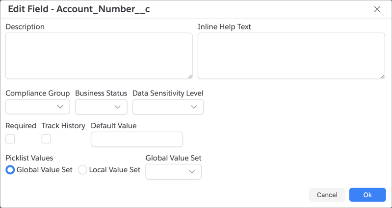 Each row in the main interface allows you to specify only basic field properties. To configure additional properties for each field, click on the Pencil icon in the field you want to edit. This is especially useful for Picklist fields or if you want to configure field metadata like Owner, Compliance, etc.,