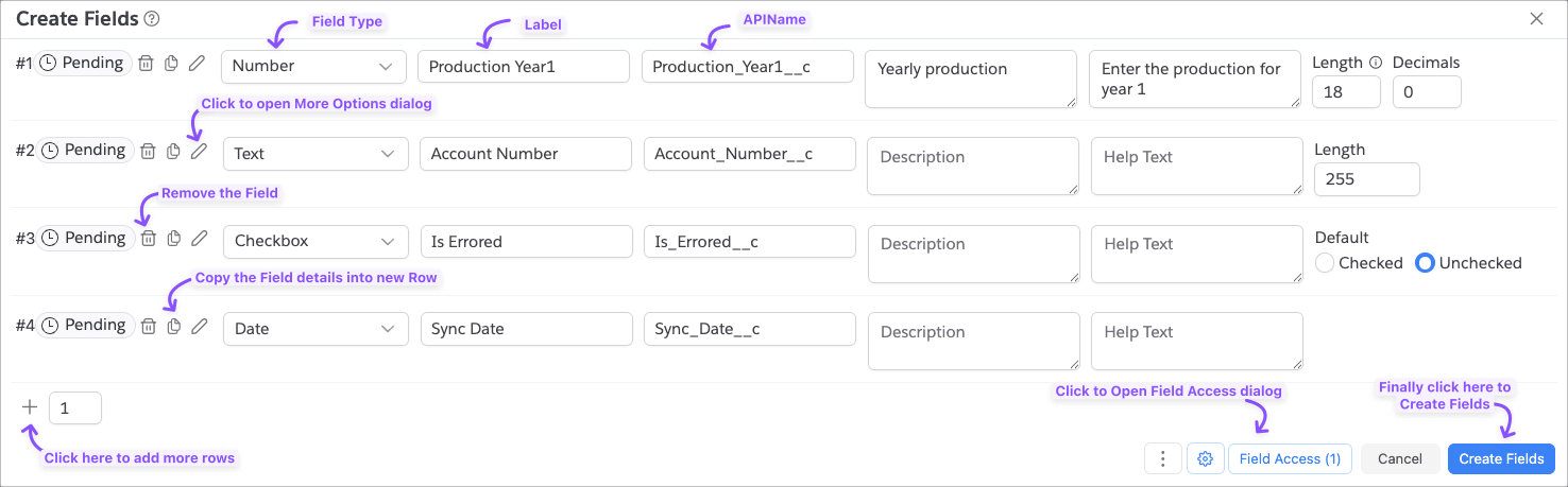 The Create Fields feature allows you to efficiently create multiple custom fields in bulk with comprehensive configuration options. This powerful tool enables you to define field properties, configure access permissions for both profiles and permission sets, and speed up the field creation process with access presets to assign pre-configured access permissions with the click of a button.