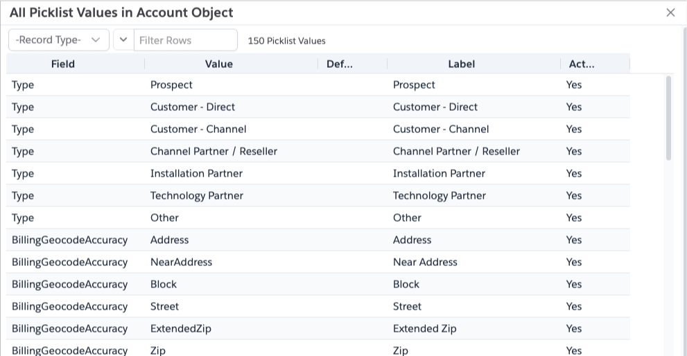 Then the app will show you the below dialog with all Picklist Values for all fields in that object. From the Datagrid, you can search for a particular value, filter by Record Type, or Export it as CSV/Excel/Google Sheet or Office 365 files.