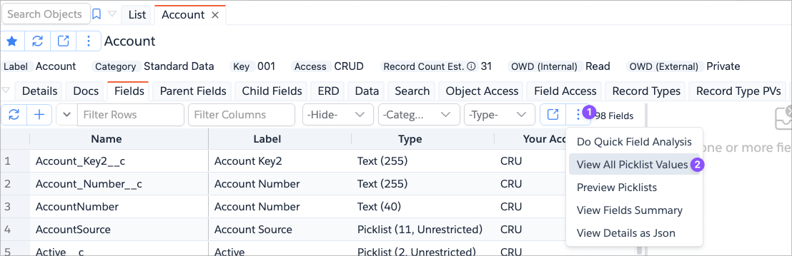 Selecting a field, the Field Details panel shows the picklist values for that field. If you want to see all picklist