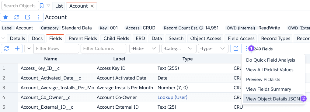 To access go to Fields tab, and click More Actions Menu -> View Object Details JSON.