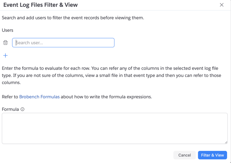 Click Filter & View to open the dialog shown below. There, you can select one or more users and enter a Brobench formula.