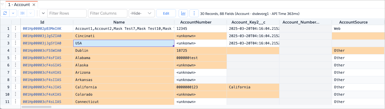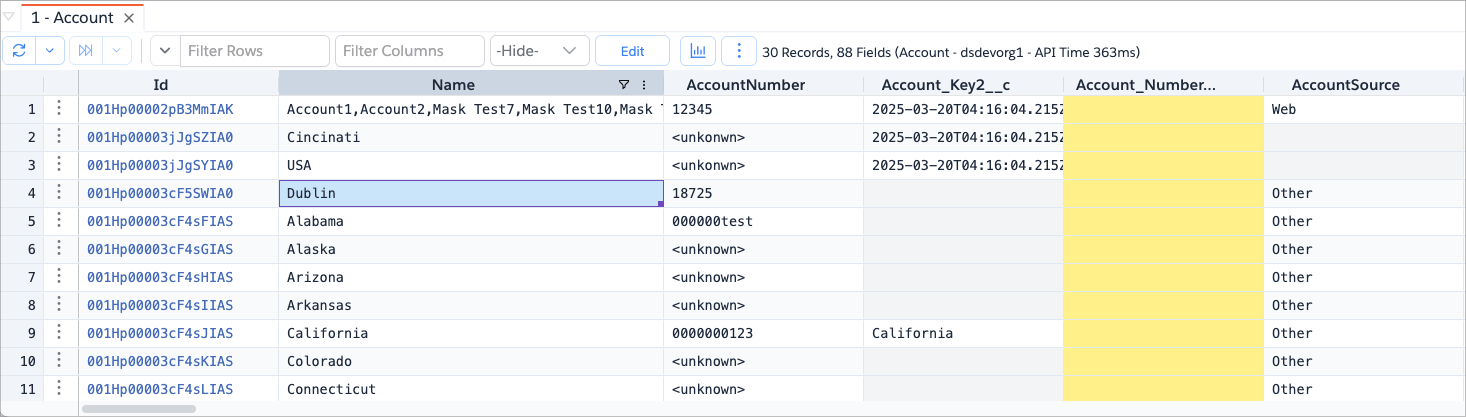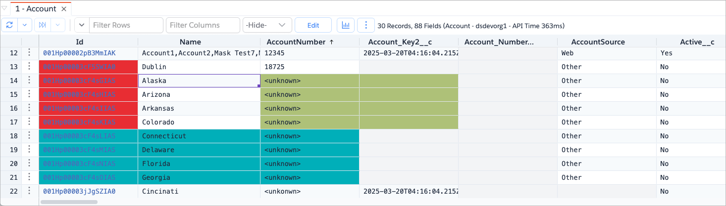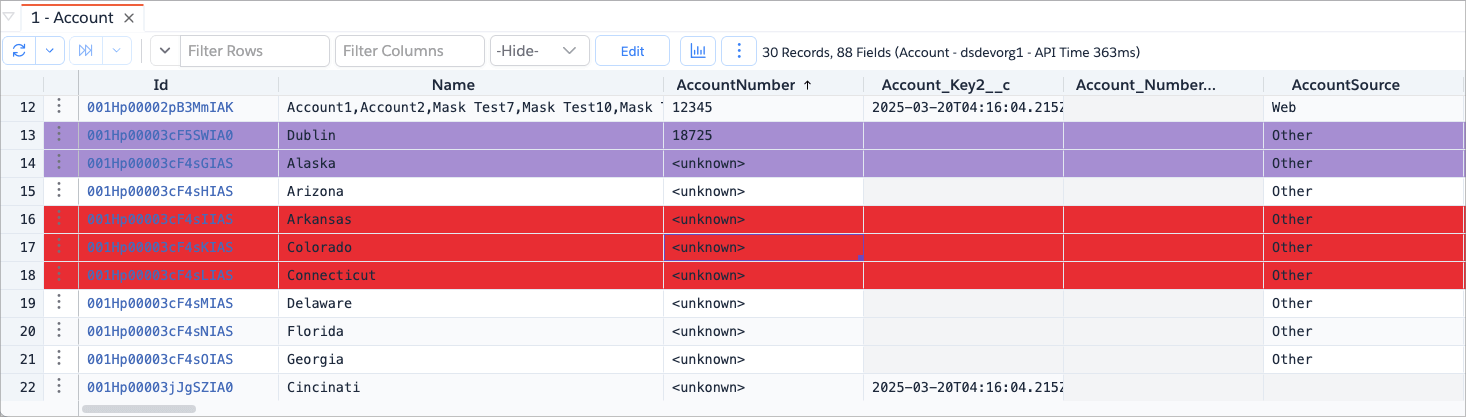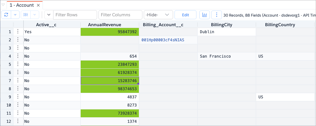 In the example blow, the "Account_Number__c" column is highlighted because all rows have empty values for that field.