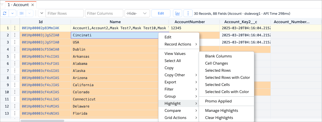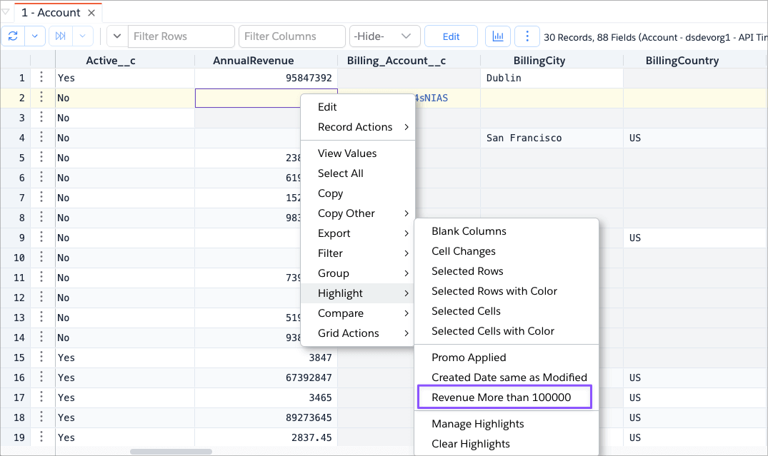 For example, in the below screenshot, the custom highlight "Revenue more than 100000" is applied to the "AnnualRevenue"