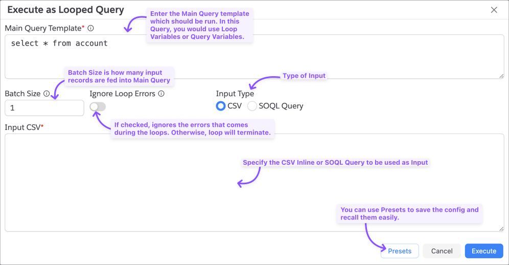 This feature can be invoked by clicking on the dropdown next to Execute button and selecting Execute as Looped Query