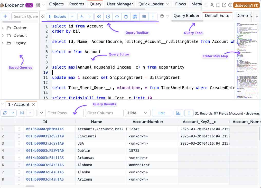 Query Editor is the most used feature in Brobench and one of the primary ways Brobench users build and execute queries. If you would rather use UI to create SOQLs, use the Query Buidler feature.