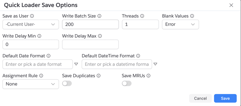 Quick Loader supports configurable Save Options to control how records are written to Salesforce.