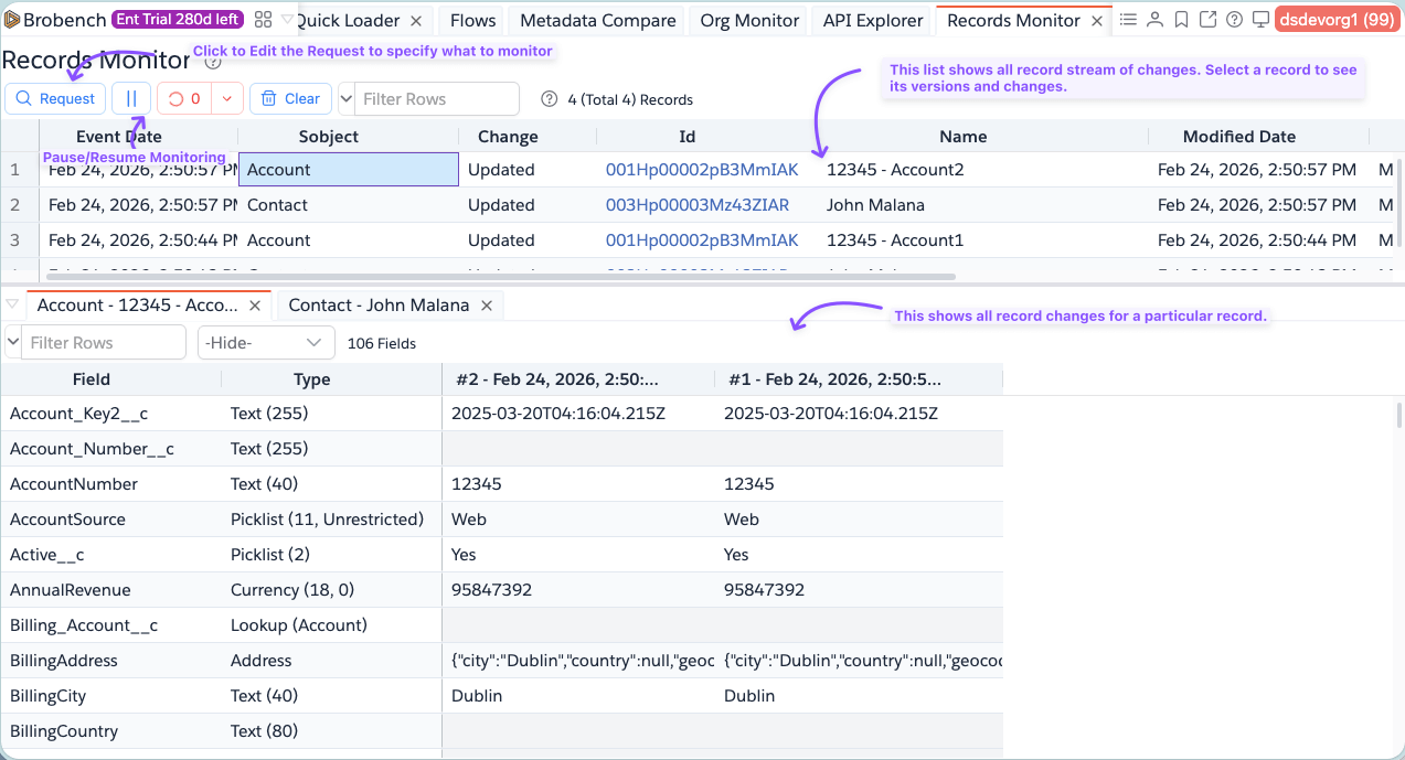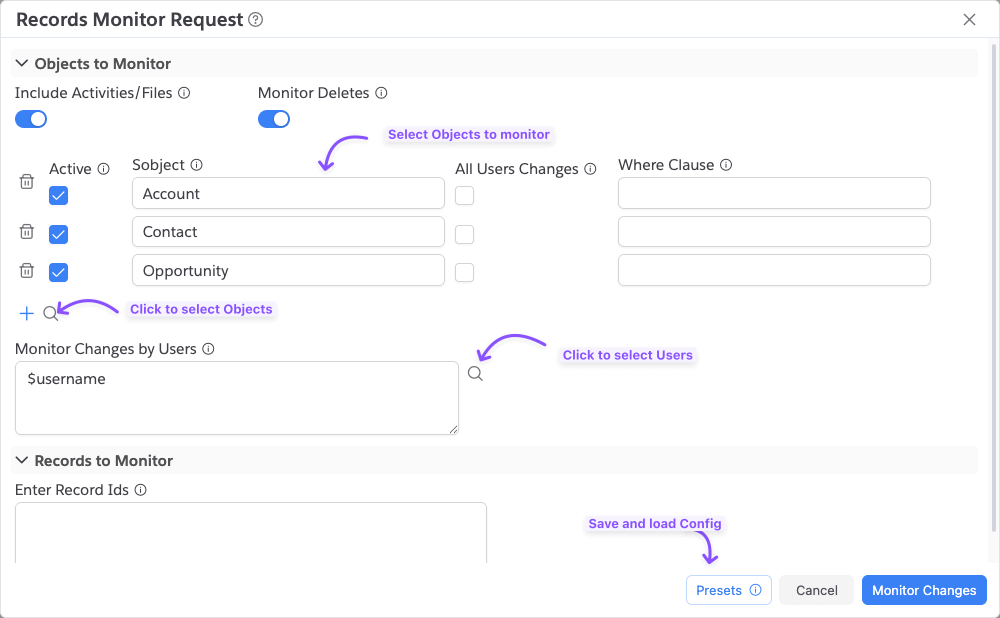 Records Monitor helps you continuously track record changes across one or more objects or specific record IDs, in a single live view.