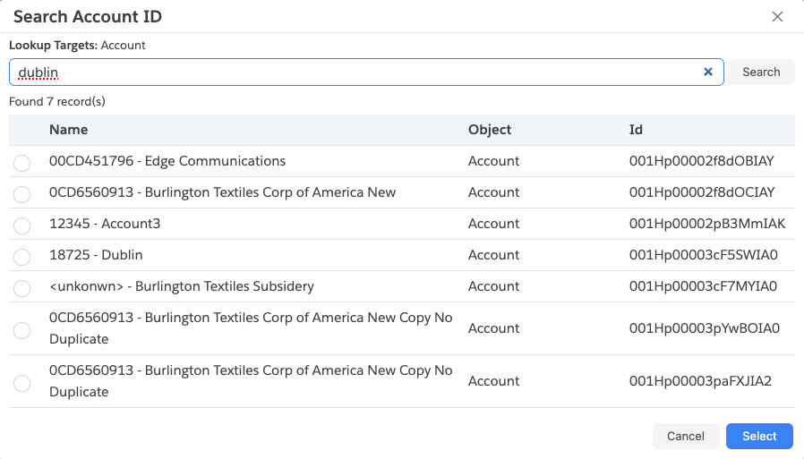 When click on it, it shows the below dialog. Enter the search term to show the results and select a record.