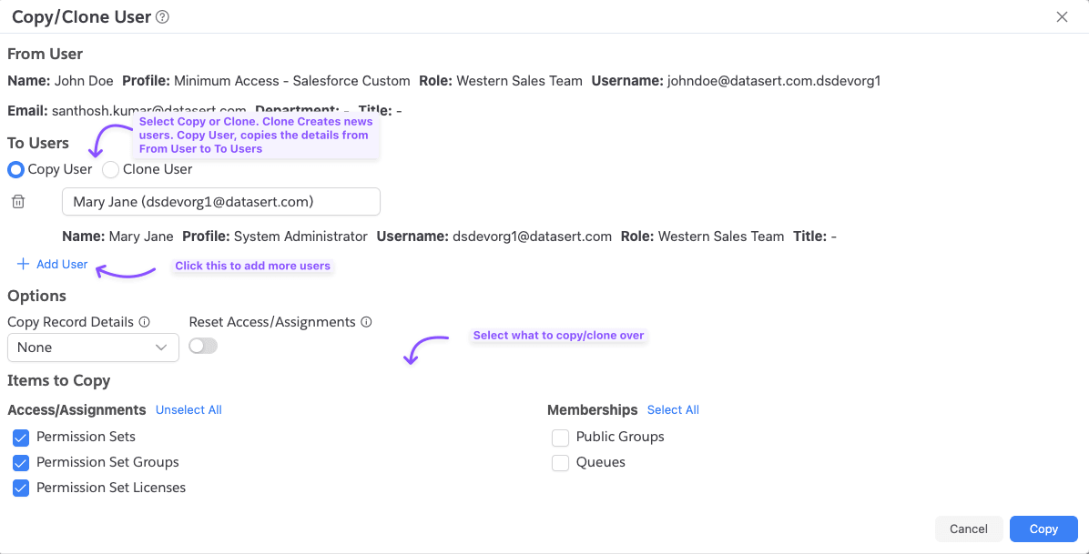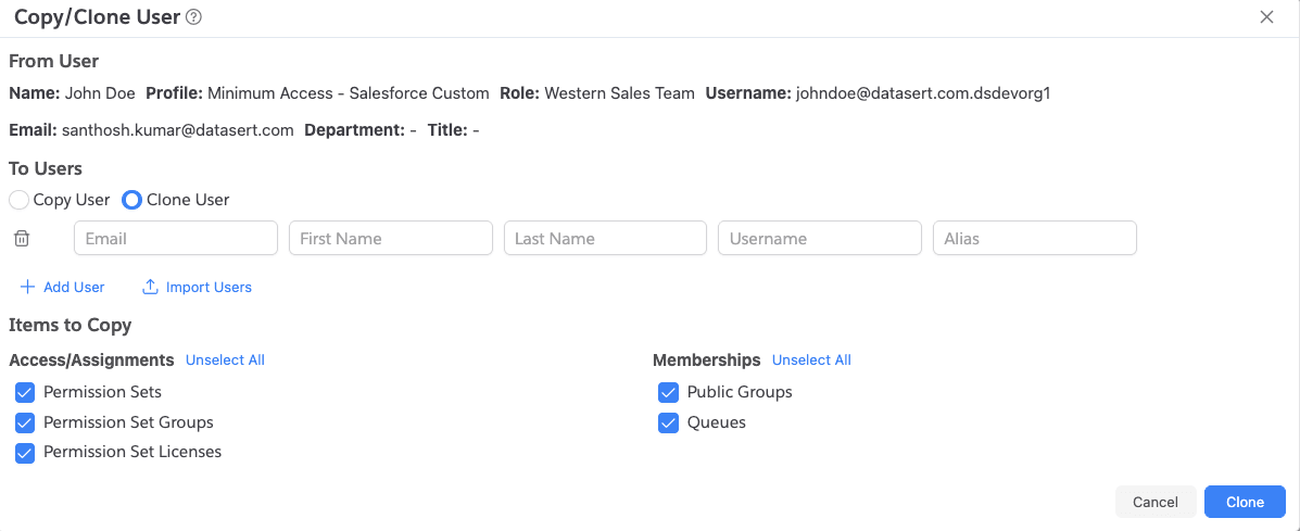 Copy Usercopies selected access, memberships, ownerships, and optional record details from the source user to existing users.Clone Usercreates new users using the selected source user as the template.