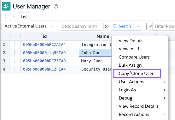 Copy/Clone User helps you take one source user from User Manager and either create new users from that source, or copy selected access and ownership-related items to existing users.