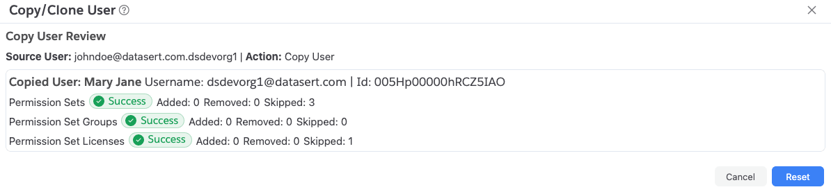 If you select Reset Access/Assignments, it will remove the Permission Sets or Permission Set Groups from the target users that are not present on the source user.