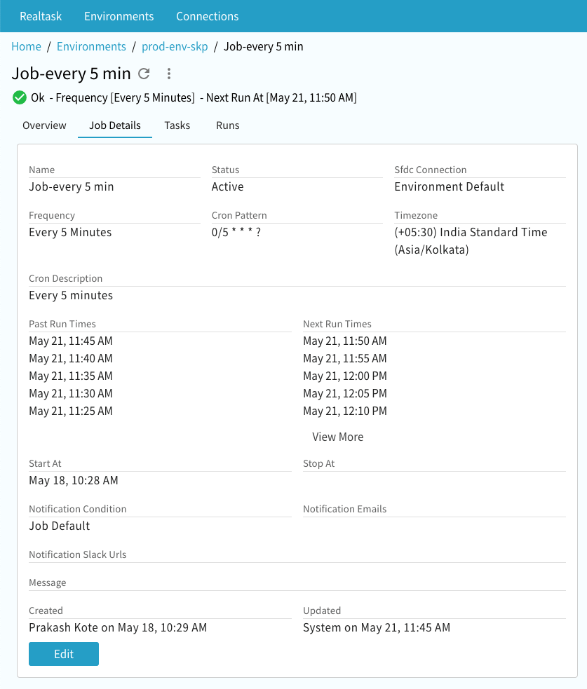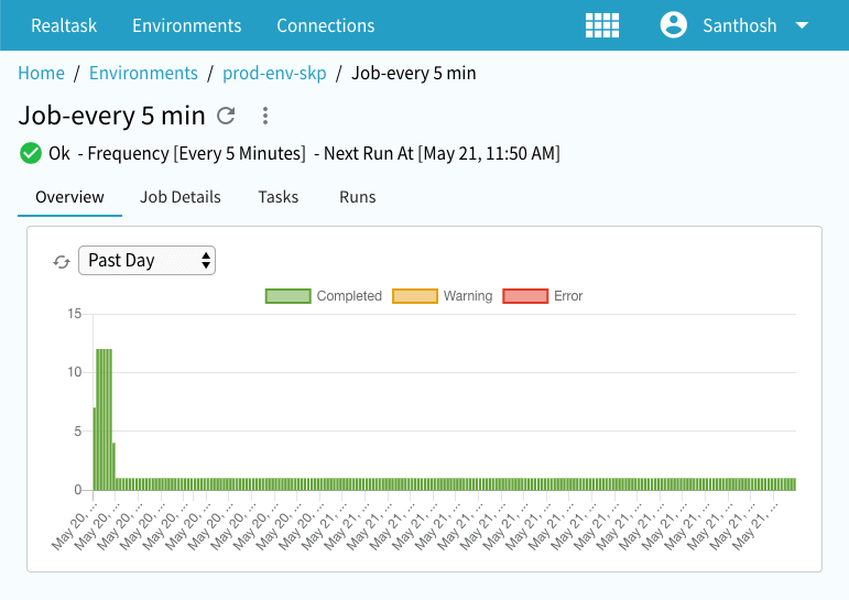 Job belongs to an Environment and consists of one or more Tasks. A Job can be executed manually any time or scheduled to be executed at a time, either for one time or repeated execution at Frequency of your choosing. We support many pre-defined Frequencies or full Cron expression with special flags.