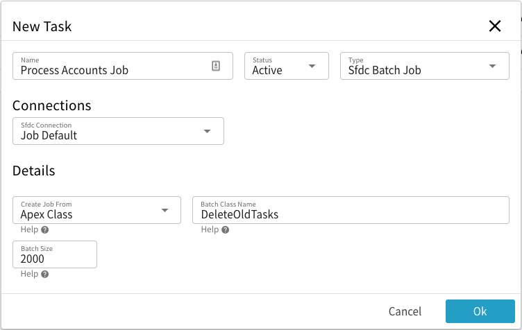| Apex Script | If Create Job From is Apex Script then this field is shown. You can enter any apex script that creates a variable named job of type Queueable. Script should not include the System.enqueue statement as Realtask system adds that automatically. | |