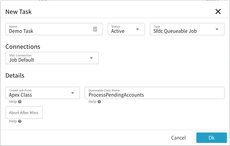 This task starts a Queueable Job in Salesforce. Once started, queueable job will be monitored for completion every 1 minute till completion and Run status will be updated appropriately once Queueable job completes.